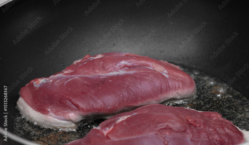 Jedzenie i Napoje - Pierś z kaczki na patelni smaży się z bliska #1513268167