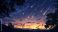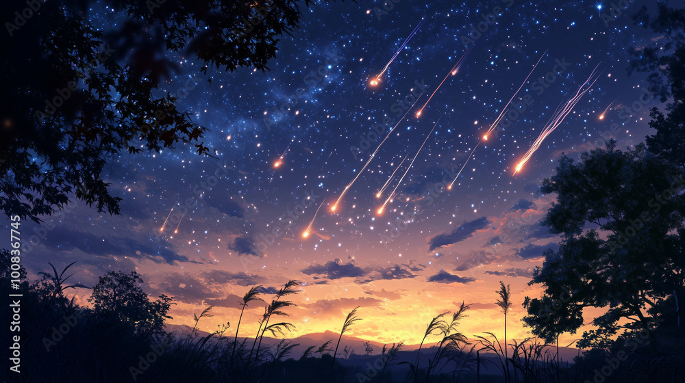 Artystyczne tło w stylu anime przedstawia fantastyczne nocne niebo, wypełnione niesamowitymi spadającymi gwiazdami.