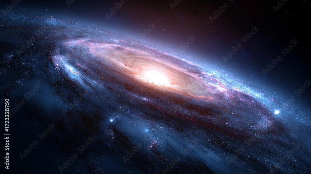 Kosmos - Leuchtende Spiralgalaxie mit rosa und blauen Farbtönen vor sternenklarem Nachthimmel #1723228750