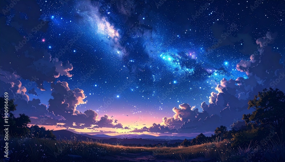 • A breathtaking night scene with a starry sky and clouds at dusk in a natural landscape