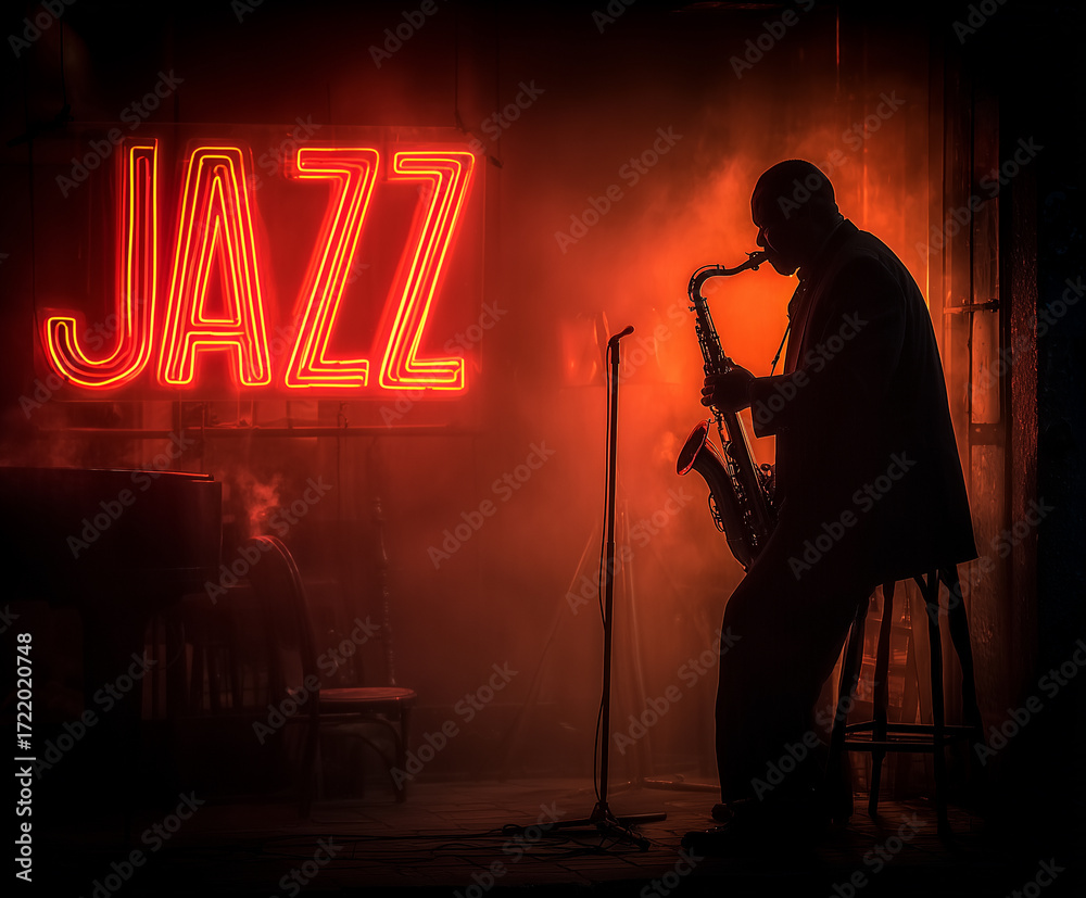 Muzyka - Jazzman w cieniu grający na saksofonie w zadymionym klubie. W tle świeci neonowy napis "JAZZ",... #1722020748