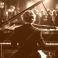 • Czarno-białe zdjęcie pianisty grającego na fortepianie w oświetlonym pomieszczeniu, podczas gdy publiczność siedzi w cieniu.