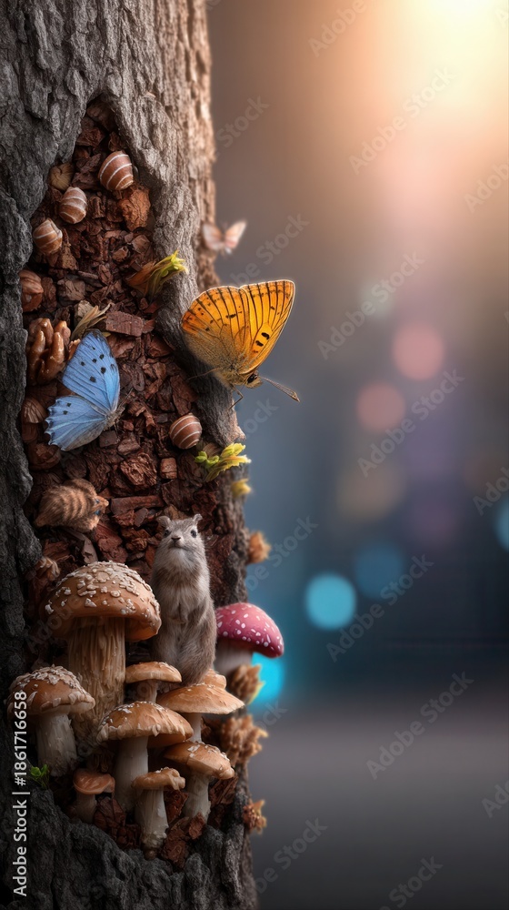 • Whimsical forest scene with butterfly, squirrel, and mushrooms on tree trunk