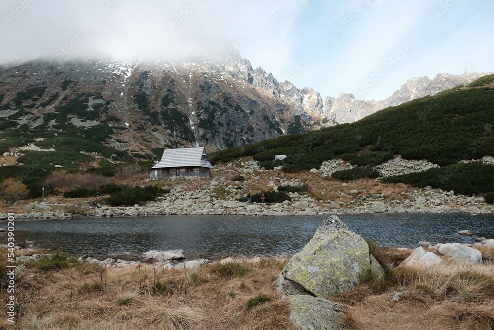 Mosty - Valley of Five Polish Ponds in Polish High tatras most beautiful Place on earth. Wooden building... #540390201