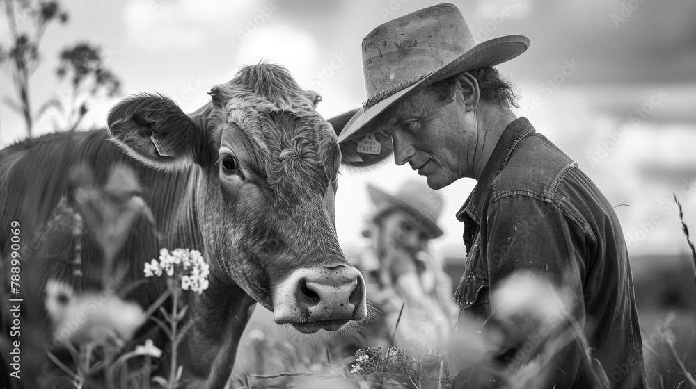• A captivating black and white photograph captures a male and a female farmer tending to their herd as they affectionately rub a vibrant organic cow on their farm