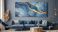 • Nowoczesny salon z niebieską sofą i abstrakcyjnym złoto-niebieskim obrazem na ścianie — elegancka aranżacja wnętrza