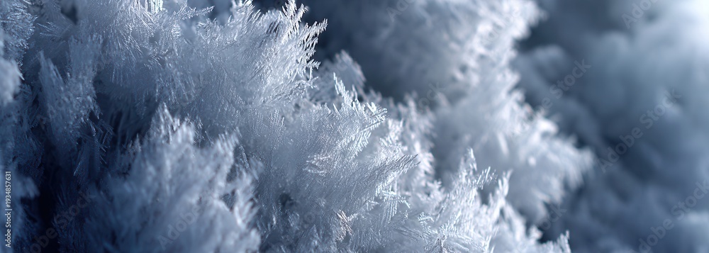 • Zbliżenie na krystaliczną strukturę szadzi lub lodu, zimowy, niebiesko-biały, abstrakcyjny wzór natury.