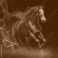 • Czerwony koń w biegu otoczony czerwoną mgłą na czarnym tle