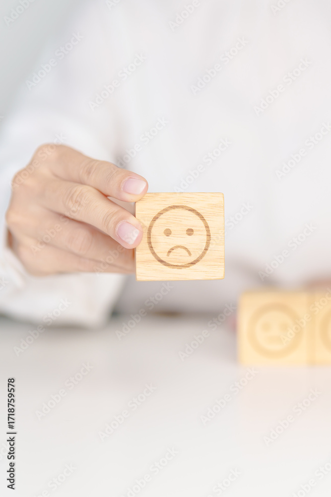 • Woman show Unhappy Sad face block, Mental health Assessment, Psychology, Health Wellness, Feedback, Customer Review, Experience, Satisfaction Survey, Negative Thinking and World Mental Health day