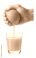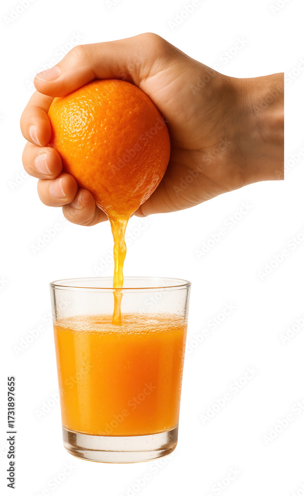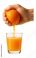 • Hand squeezing ripe orange, pouring juice into a glass.