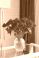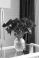 • Vase with beautiful red roses and candles on glass coffee table in stylish living room