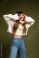 • Young woman radiating warmth in cozy autumn fashion while posing with joy