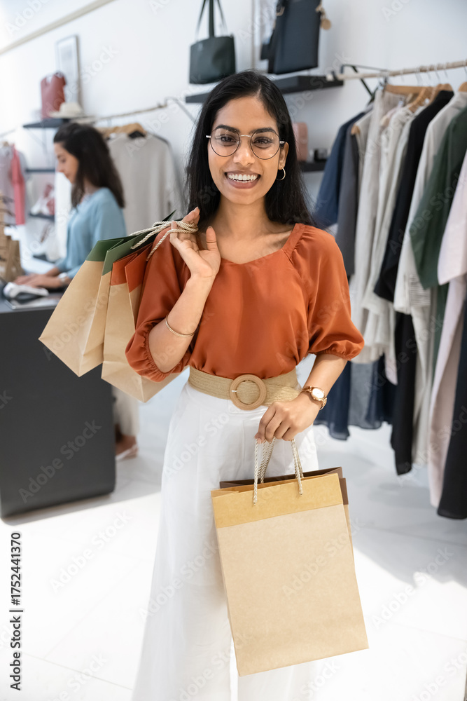 • Happy young Indian fashion boutique customer holding paper shopping bags