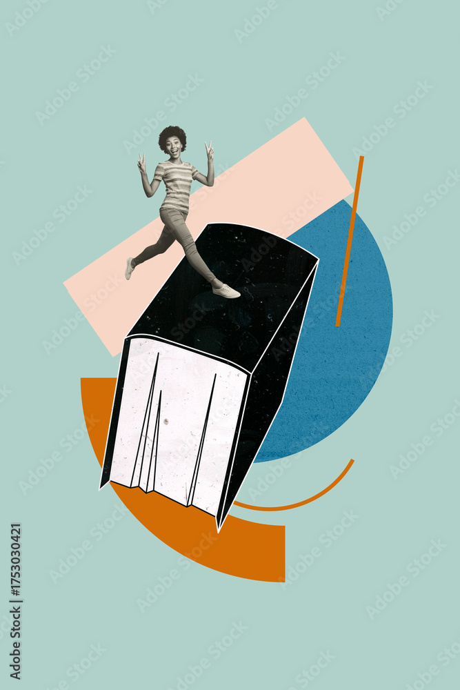 • Composite sketch image design trend artwork collage of poster education textbook study library young lady run smile stand book knowledge