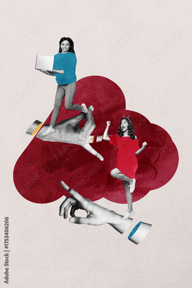 Do Sypialni - Vertical poster sketch 3d collage of two happy girl guy stand human hands point development... #1753406206
