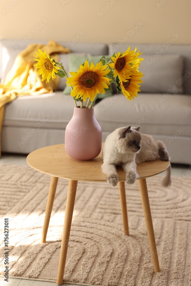 • Beautiful sunflowers in vase and cat on wooden coffee table indoors