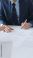 • Businessman signing a contract papers at the white desk in office, colleagues applauding to the successful results of negotiations. Business people concept