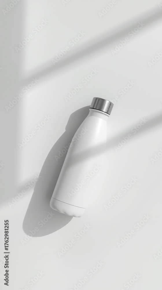 • White stainless steel water bottle on clean background, minimalist eco thermos