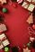 • Christmas border flat lay with gifts, gingerbread cookies, candy canes and baubles on red background. Festive holiday frame with copy space for seasonal design