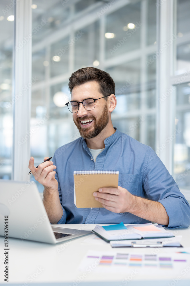 Do Sypialni - Smiling man engaging in a video conference from his modern office desk, holding a notebook and... #1765876440