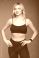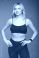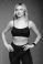 • Beautiful young blonde woman in black sportswear on a gray background