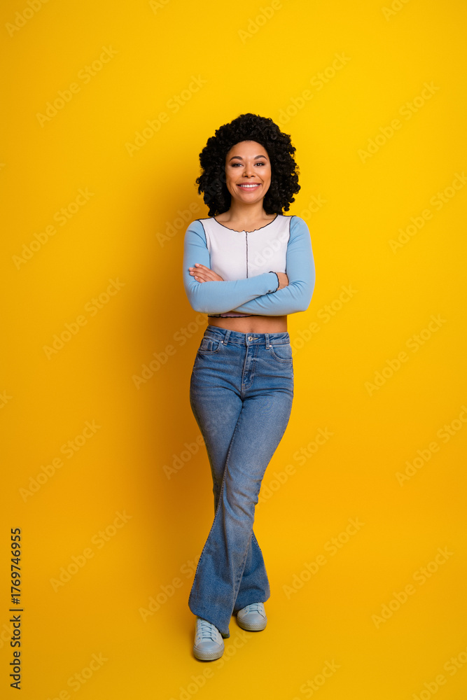 • Smiling young woman in casual fashion poses against a vibrant yellow background, exuding confidence and charm
