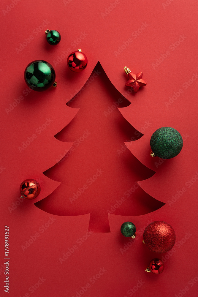 • A red vertical backdrop features a stylized Christmas tree cutout surrounded by green and red ornaments, creating a festive holiday scene ideal for greeting cards and seasonal projects
