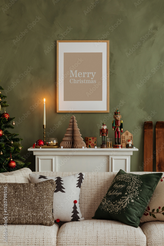 Do Sypialni - Festive decor with nutcrackers, candles, and mock up poster print. Subtle holiday charm in earthy... #1780798516