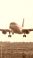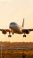 • An airplane approaches the runway during sunset, with landing lights illuminated. The warm glow of the sky enhances the scene.
