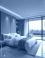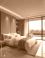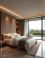 • Modern bedroom with large bed, white linens, wooden wall, spacious terrace overlooking green landscape. Soft warm light accents ceiling, shelves. Minimalist interior design creates calm atmosphere