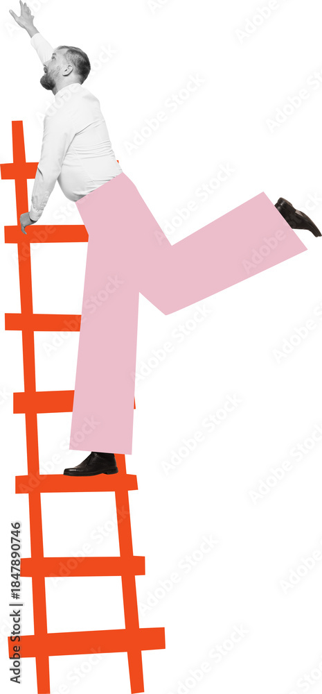 • Conceptual design of businessman climbing ladder toward goal on transparent background. Concept of career growth, leadership ambition, business progress and corporate motivation for advertising use.
