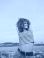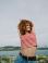• Young woman with curly hair in a red striped top and denim jeans stretches her arms above her head, smiling confidently near a calm waterfront under a bright sky.