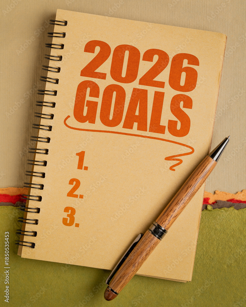 • 2026 goals list in a notebook with pen, setting New Year goals and resolutions