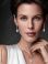 • Elegant woman with short brown hair wearing diamond earring and pendant, white dress, confident expression, studio portrait