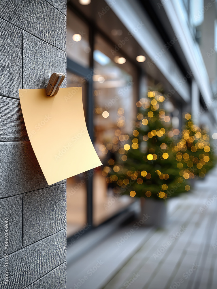 • Yellow sticky note on gray wall with blurred outdoor Christmas trees and festive lights, urban street scene, winter holiday mood