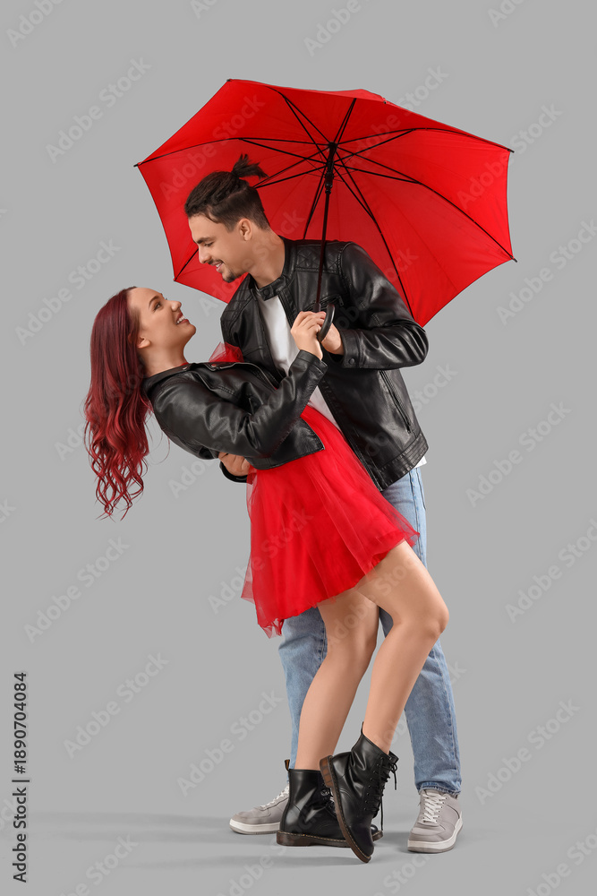 Do Sypialni - Young lovely couple with umbrella on grey background. Valentine's Day celebration #1890704084