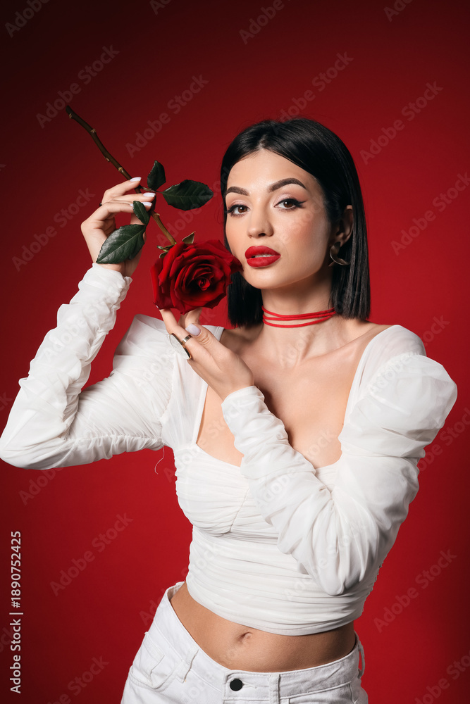 • Beautiful young elegant woman with rose on red background