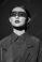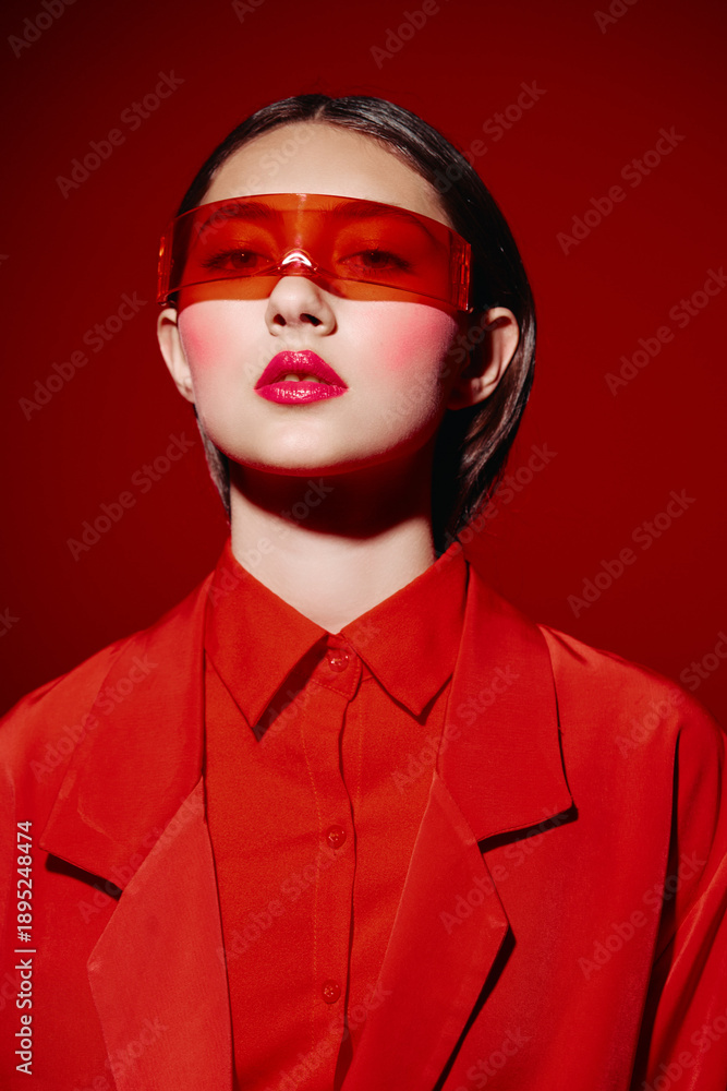 • Young fashionable woman in bright red blazer and shirt looking confidently at the camera. She wears oversized red translucent sunglasses. Studio portrait with vivid red background, creative beauty