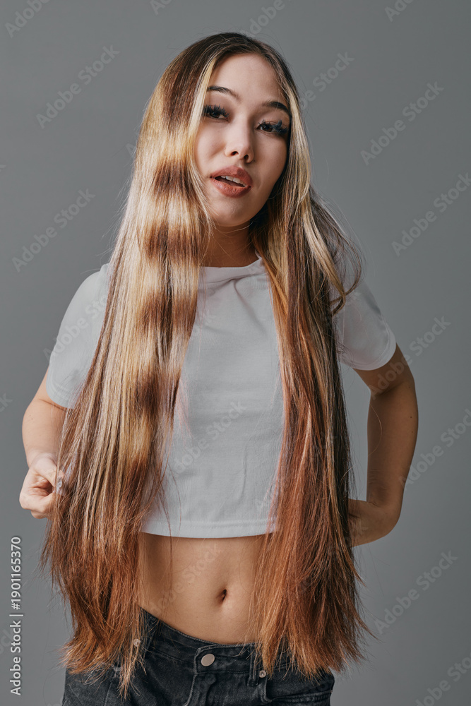 • Young woman with long straight hair posing in casual white crop top and dark pants, looking confident and stylish against a neutral gray background indoors.