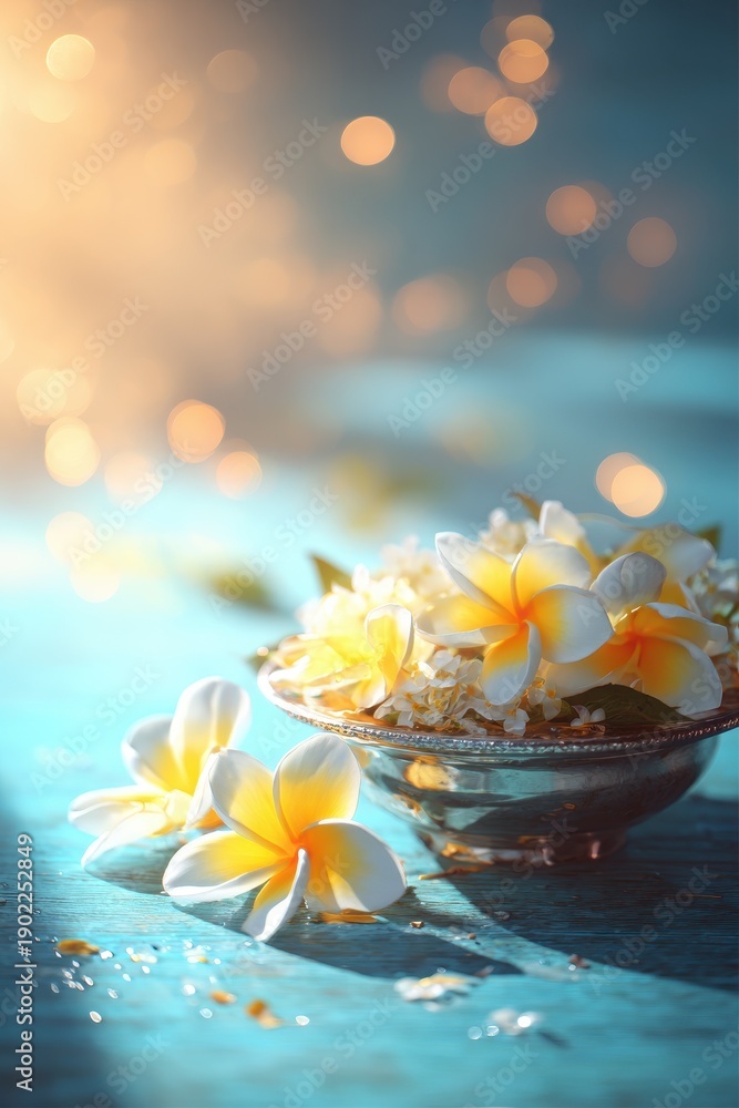• A silver bowl filled with white and yellow frangipani flowers sits on a blue wooden table. Soft golden bokeh lights create a dreamy atmosphere in the background of this floral scene.