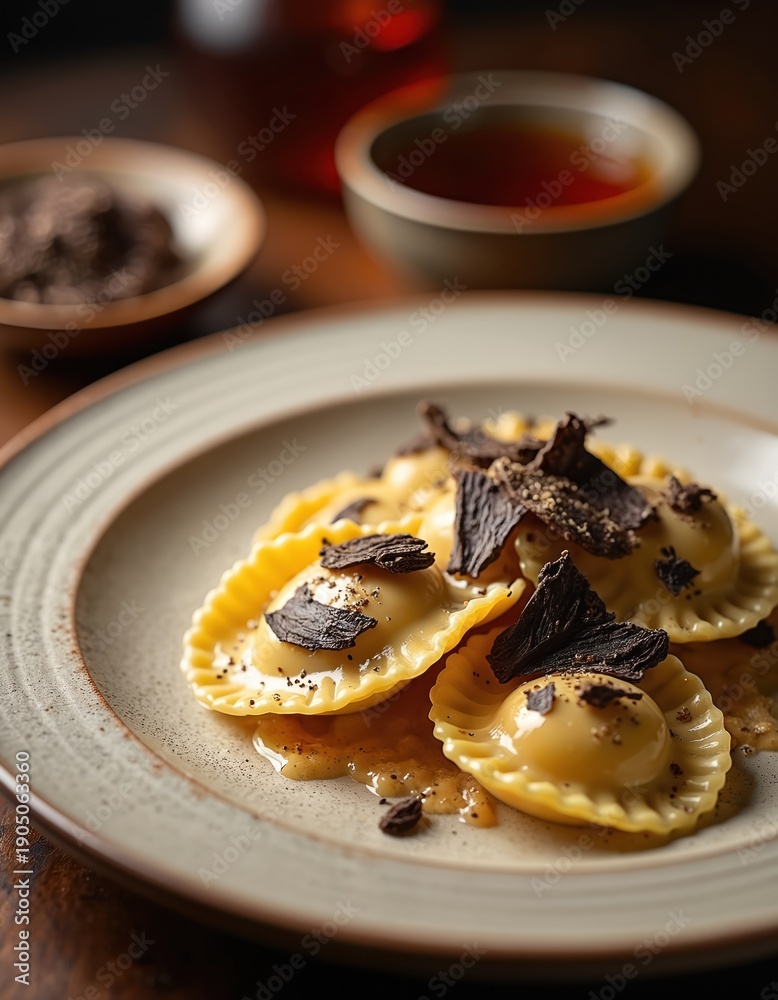 • Close-up of truffle ravioli served on rustic plate. Delicious pasta dish with rich sauce and dark truffle shavings. Upscale dining experience for gourmet food lovers.