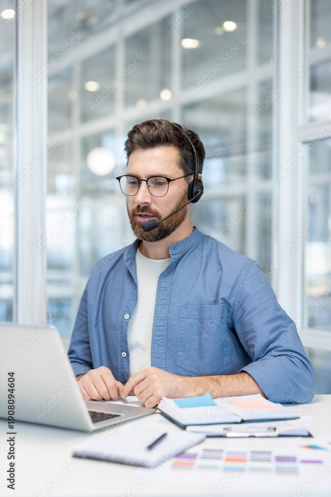 Do Sypialni - Male professional wearing a headset and spectacles, actively typing on a laptop while working on... #1908094604