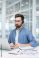 • Male professional wearing a headset and spectacles, actively typing on a laptop while working on customer support, telemarketing, or online education in a modern office setup