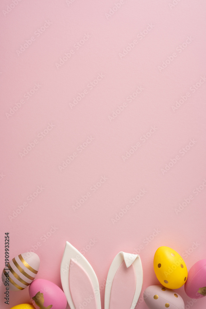 Do Sypialni - Soft vertical pink backdrop sets a gentle mood for Easter greetings. Colorful eggs and bunny ears... #1909933254