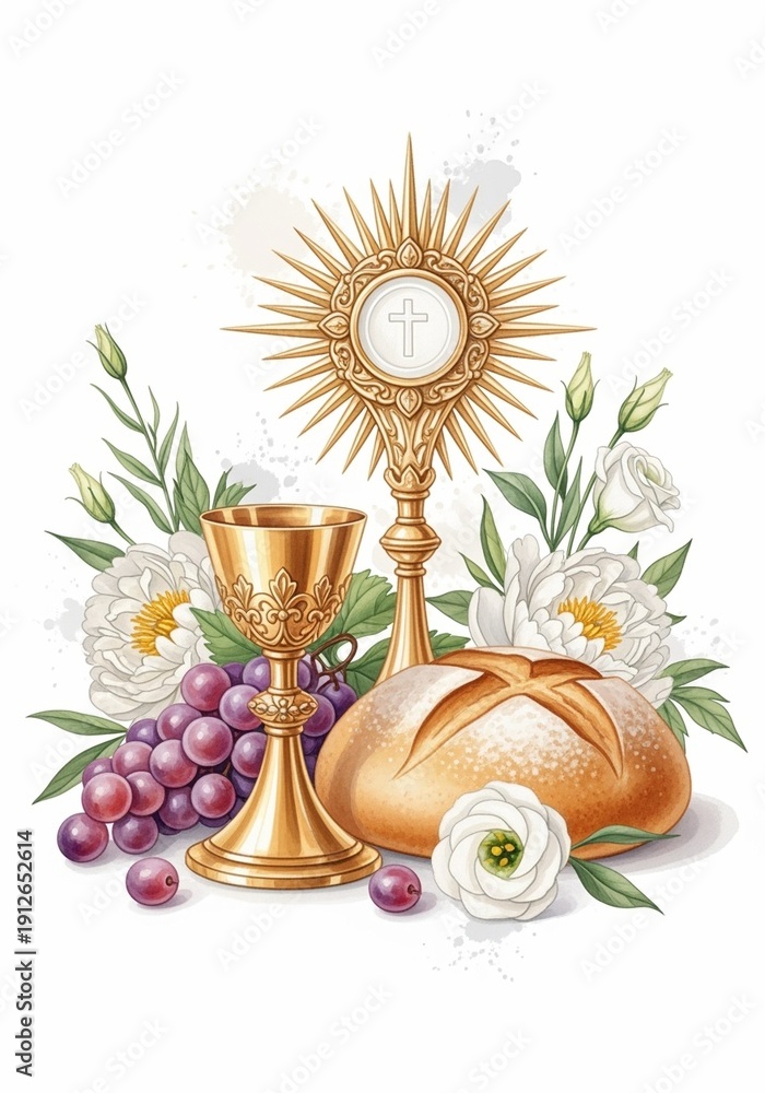 • First Holy Communion watercolor composition with golden chalice, host, grapes, bread and white roses, religious christian celebration element isolated on white background