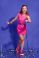 • Charismatic young woman in vibrant pink dress excitedly posing with microphone and confetti on bold purple background