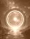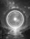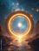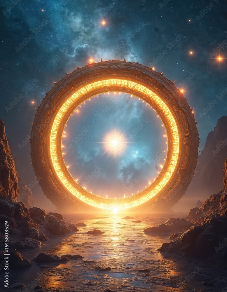 • Golden ring gate in space on alien planet. Sci-fi portal with bright light and stars. Futuristic cosmic landscape with water and rocks. Space exploration adventure.