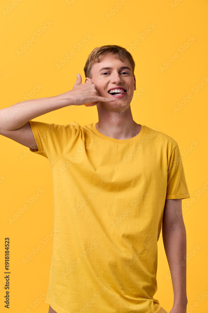 • Cheerful man in a yellow shirt makes a phone gesture, depicting casual communication, friendly vibe, and sunny energy against a bright studio background.