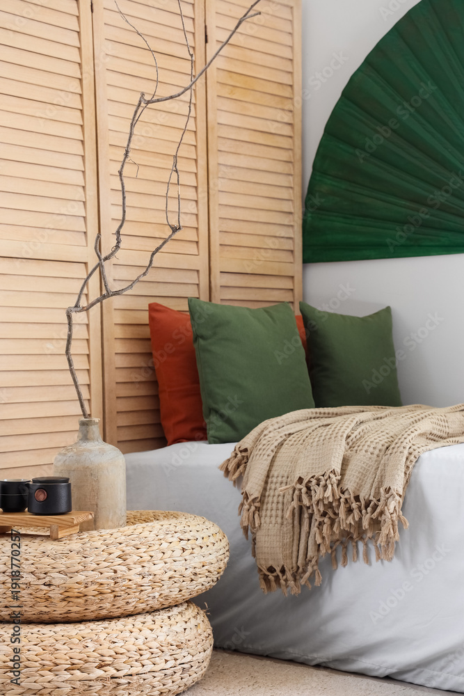 Do Sypialni - Interior of bedroom with folding screen, tree branches in vase and Chinese decor #1918770257