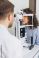 • Patient having an eye examination with optometrist using a slit lamp for vision checkup and ophthalmology care